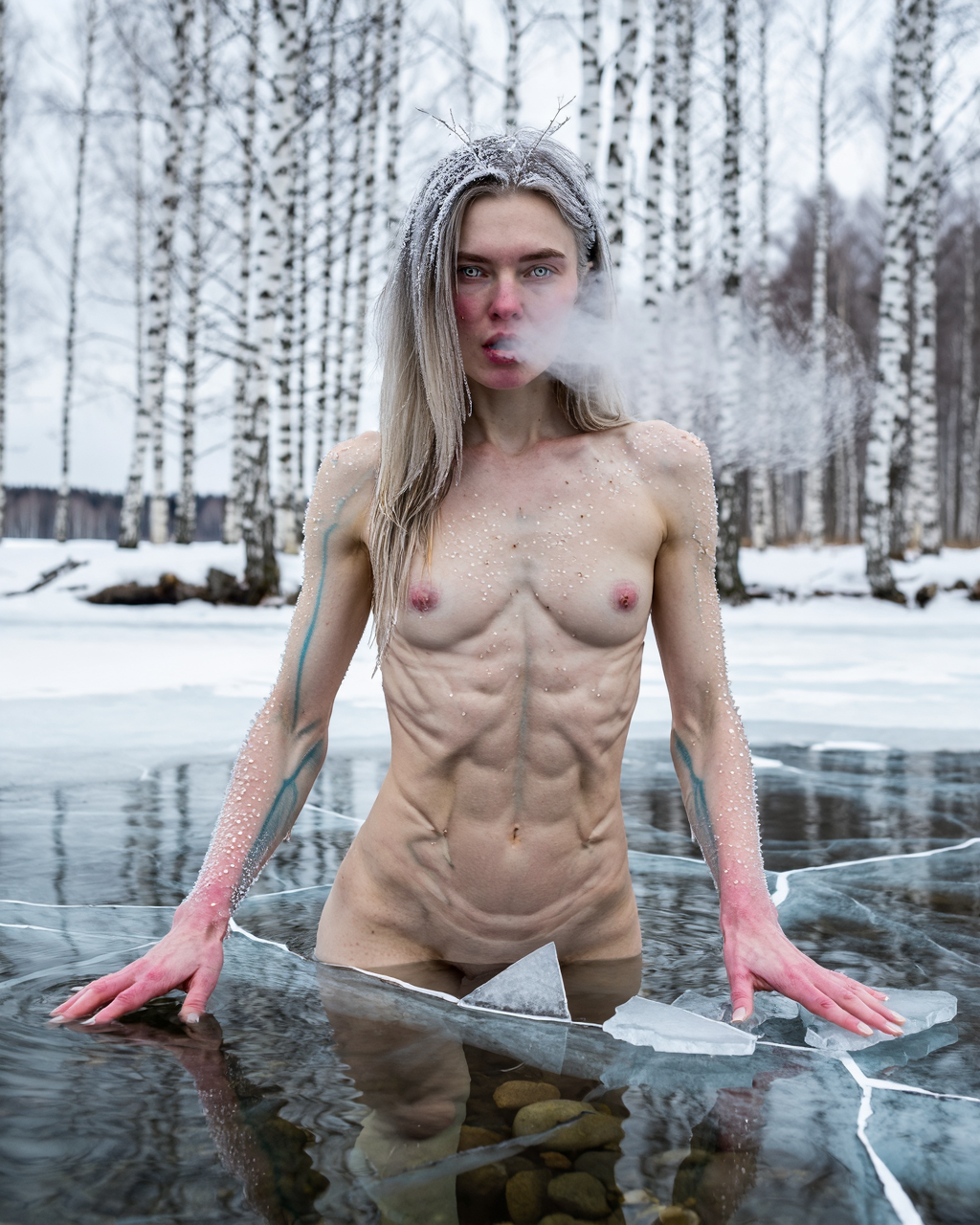 Stark fine art photograph, lean woman, 5'9 approximately 53kg, austerely beautiful with a long rectangular face, pale grey eyes so light they nearly blend with the winter sky, thin arched brows several shades darker than her hair, narrow straight nose reddened at the tip by cold, wide flat mouth with pale lips slightly chapped and raw, very fair skin with a blue-cool undertone flushing deep pink at her cheeks and ears and knuckles and the tips of her breasts from the freezing air.