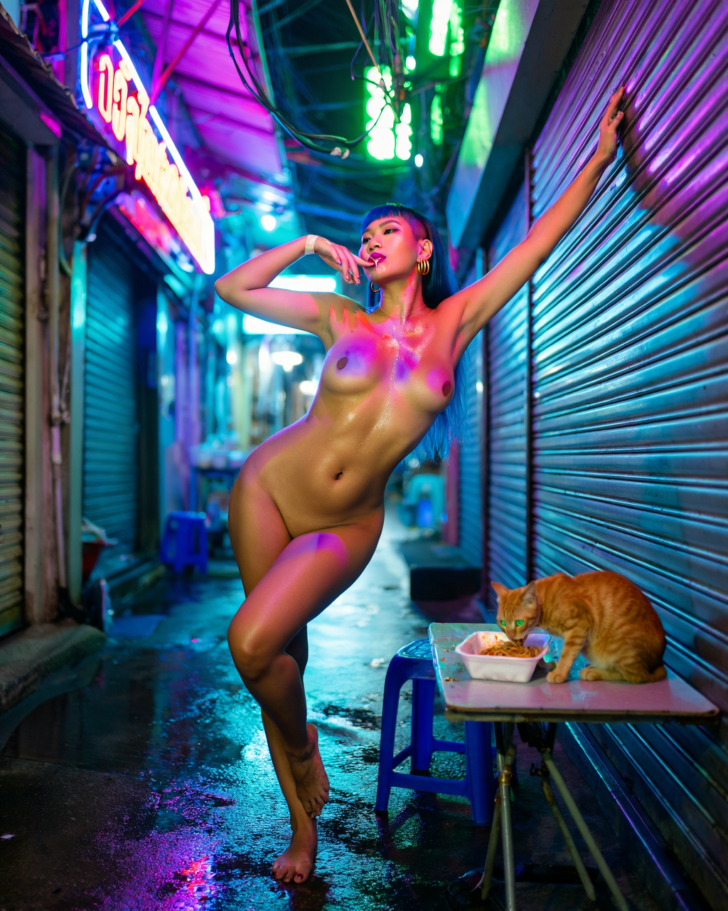 Electric fine art photograph, slim curvy woman, 5'3 approximately 52kg, disarmingly beautiful round face with a wide flat forehead, high broad cheekbones, single-lidded dark-brown eyes with an upward tilt at the outer corners, short flat nose with wide nostrils, a generous bow-shaped mouth with a full lower lip that catches neon light as a permanent wet highlight, warm golden-tan Southeast Asian skin with a natural oily sheen across her T-zone and décolletage.