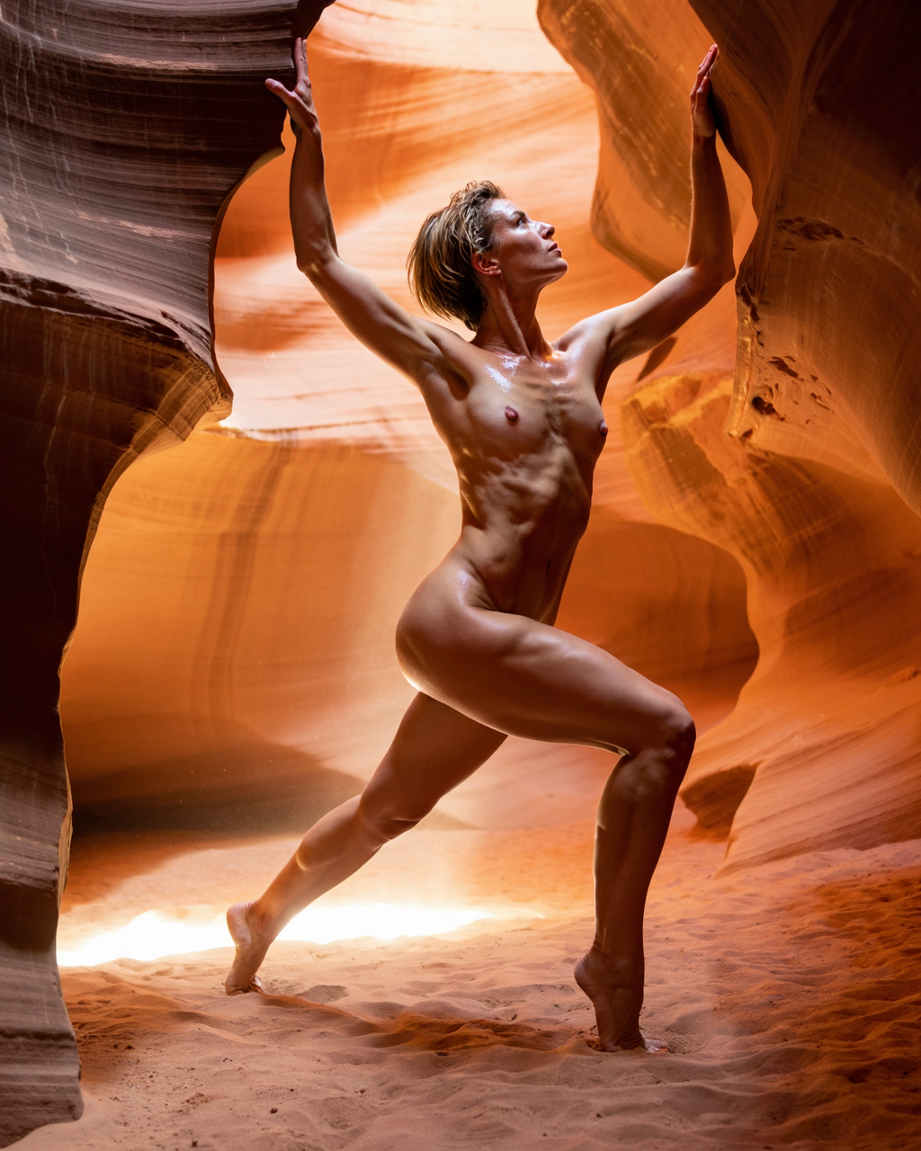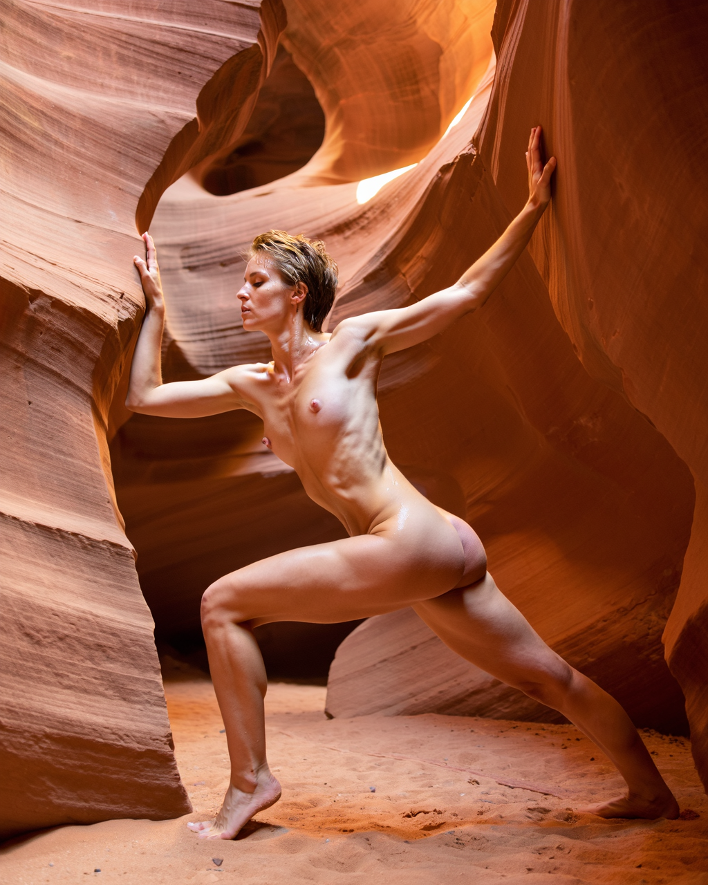 A lean woman stands nude in profile inside a narrow sandstone slot canyon, one leg forward in a deep lunge, torso twisted toward camera, arms reaching behind her to press both palms flat against the warm canyon wall. Body type lean—long and angular, visible deltoid and trapezius definition from the press, small breasts with pale pink nipples, the nearer breast in full profile showing its slight upward tilt and conical shape, ribcage expanding with a held breath.
