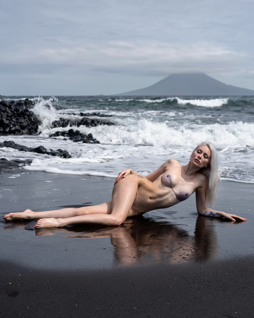 A slim hourglass woman lies on her side fully nude on a jet-black volcanic sand beach, wet sand glistening beneath her like crushed obsidian. She props herself on one elbow, opposite hip cocked high, creating a dramatic hourglass silhouette. Body type slim hourglass—breasts heavy and stacked, the lower one pressing into the sand and spreading slightly under its own weight, the upper one resting on top with the nipple—dark mauve against fair skin—pointing forward, both showing natural teardrop fullness. Waist impossibly narrow from this angle, the lateral curve scooping inward before her hip rises sharply to the highest point of the pose, the upper hip a broad smooth hill of skin.